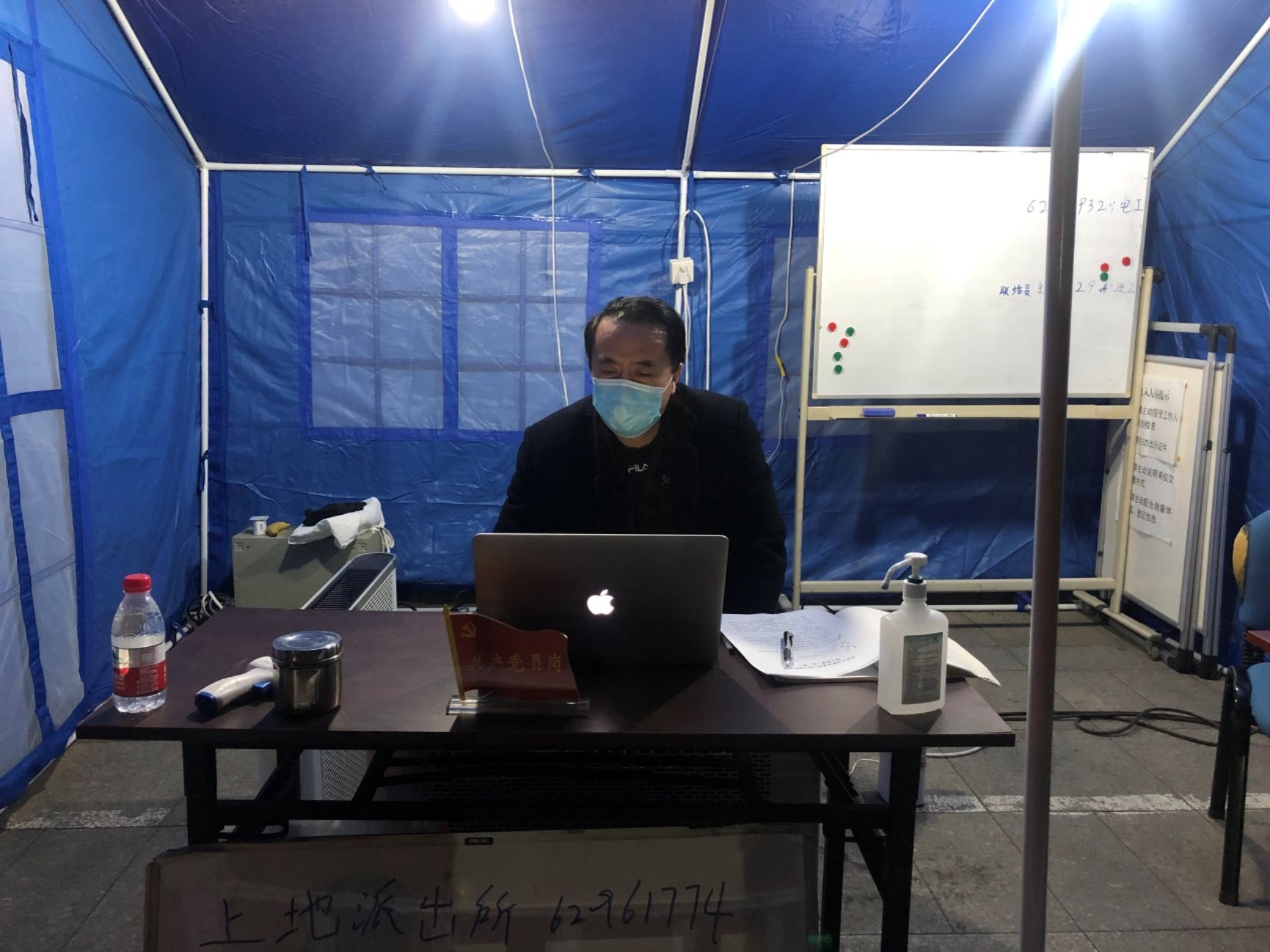 上图为孙震处(部)长在学校西门值守点主持线上学习